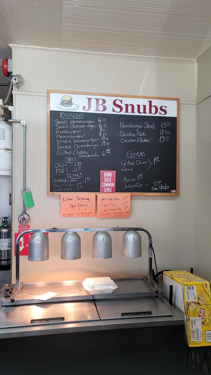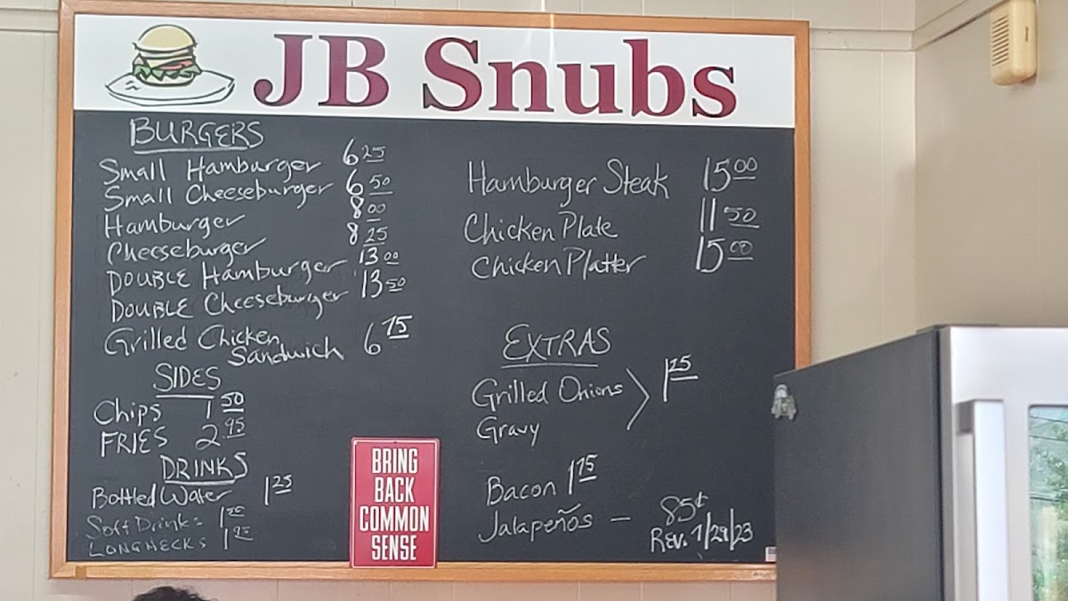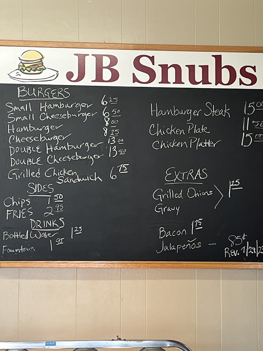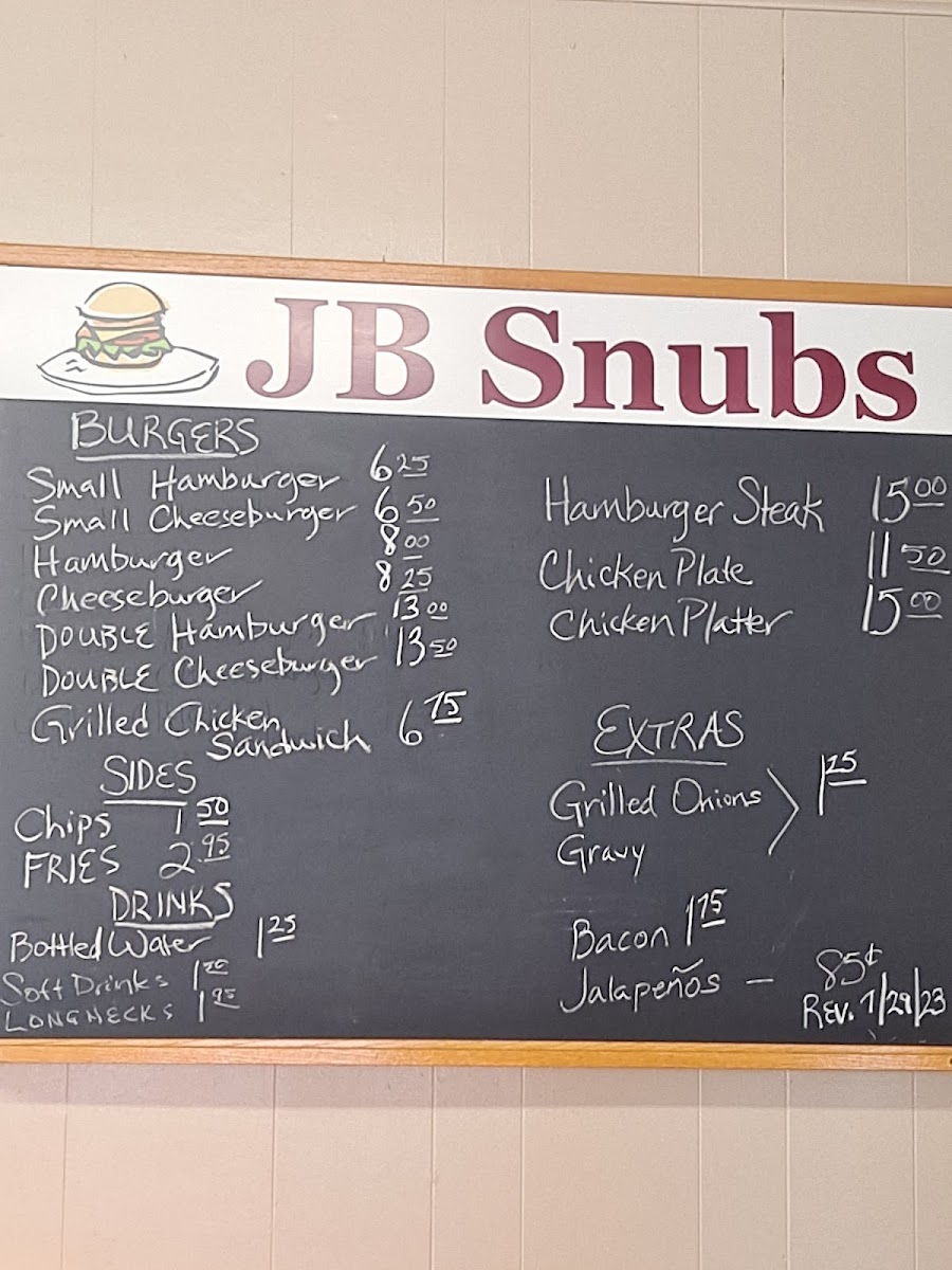 The Jb Snubs menu offers a straightforward yet satisfying selection of dishes, perfect for those craving classic comfort food. Their burger options cater to a range of appetites, from a simple Small Hamburger to a hearty Double Hamburger, ensuring everyone finds something to enjoy. For cheese lovers, the Small Cheeseburger and Cheeseburger are great choices, while the Chicken Plate provides a tasty alternative to beef. To complement your burger, the menu features a selection of sides like crispy Fries and crunchy Chips, both ideal for dipping or snacking on their own. If you're looking to add a little extra flavor to your meal, you can top your burger with grilled Onions, savory Gravy, or even a touch of smoky Bacon or spicy Jalapeños. For a refreshing drink, Jb Snubs offers Bottled Water and Soft Drinks, completing a simple yet satisfying meal. Whether you’re stopping by for a quick bite or craving a full meal, Jb Snubs Menu serves up delicious, no-frills comfort food that hits the spot every time.